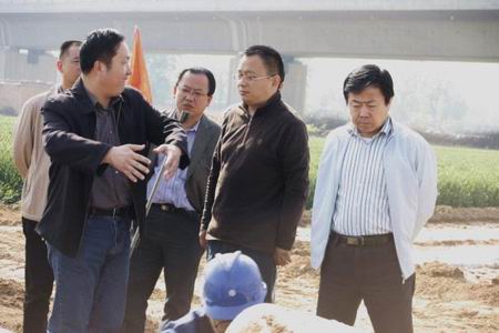 副指揮長單超(左三)向賈總(左一)、楊總(右一)匯報(bào)工程建設(shè)相關(guān)情況